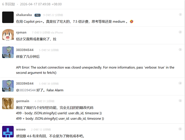 然而发布之后,用户对Opus 4.7的评价可没有官方宣传的那么好,甚至大部分评价还是负面的,认为编程能力是倒退的,还不如Opus 4.6,尤其是考虑到近期Opus 4.6严重降智,很多人都怀疑现在的Opus 4.7实际上就是之前的Opus 4.6改出来的。